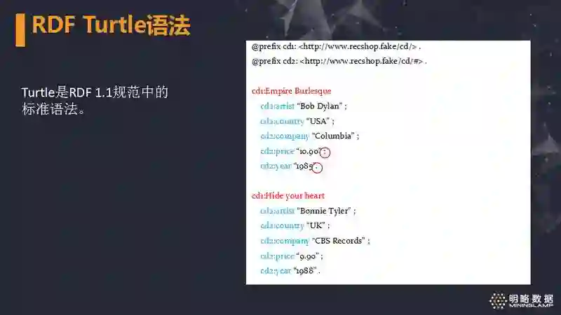 上一页中以 XML 表示的例子可以简化为如右图所示的 turtle 形式。相比与 XML 语法,省略了大量标签语言,使得文件内容更加简洁。