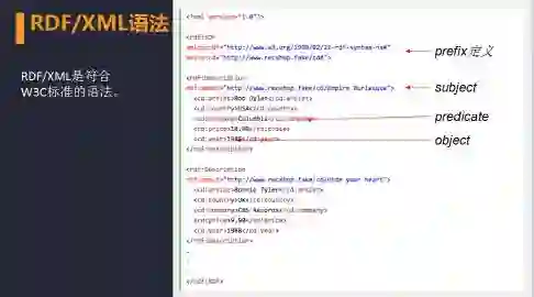 首先介绍 RDF 基于 XML 的表述语法,RDF/XML 语法是目前唯一个符合 W3C 标准的语法。