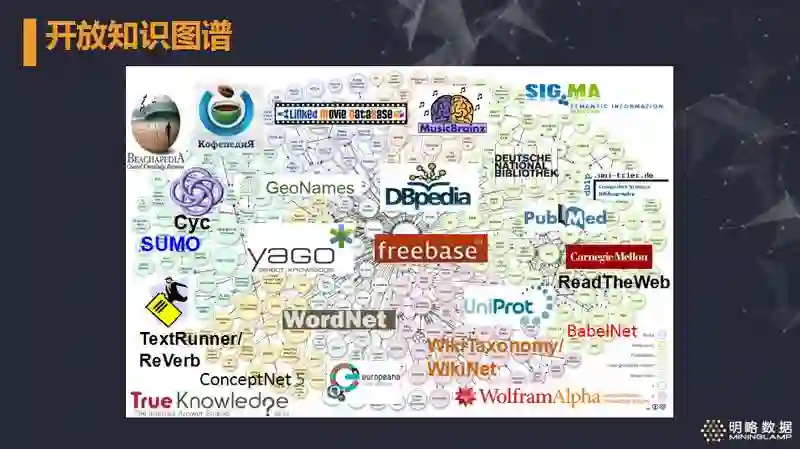 上图展示了多个典型的代表,例如 Yago,freebase,DBpedia,musicBrainz,pubMend 等。这些知识图谱为各类智能应用带来了大量结构化知识,像 Google 的 knowledge graph 包含 700 亿个事实 (facts)。