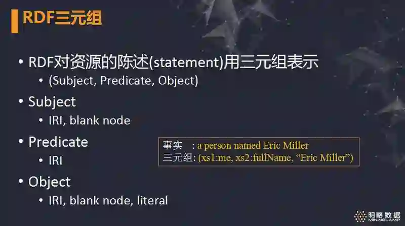 其中,subject 的取值可以为 IRI,blank node; predicate 取值为 IRI,object 的取值则是 IRI,blank node 和 predicate。