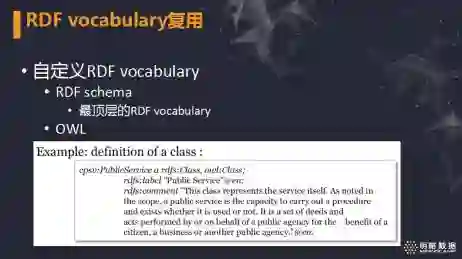 当然,在现有的 RDF 字典无法满足我们的实际需求的时候,可以结合 RDF schema 和 OWL 两种语言进行字典的自定义。下图给出了一个样例,我们自定义了一个 PublicService 类。