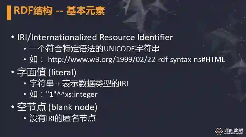 RDF 为描述资源提供的基本元素有 IRI,字面值和空节点 (blank node)。IRI 就是一个符合特定语法的 UINICODE 字符串,如