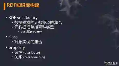 例如,用 RDF 描述一本书,RDF 字典就需要定义一本书需要包含作者、书名、页数、出版时间、语言类型等。RDF 字典定义了数据建模的元数据项,这些元数据项主要包括两种类型 class 和 property。