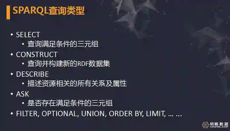 SPARQL 中查询类语句主要包括四种,分别是 SELECT,DESCRIBE,CONSTRUCT,AKS。