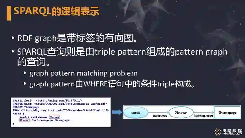 WHERE 条件语句中的 Triple pattern 也对应了一个含有变量信息的 RDF graph,那么 SPARQL 查询问题就转化为了一个图模式匹配问题。