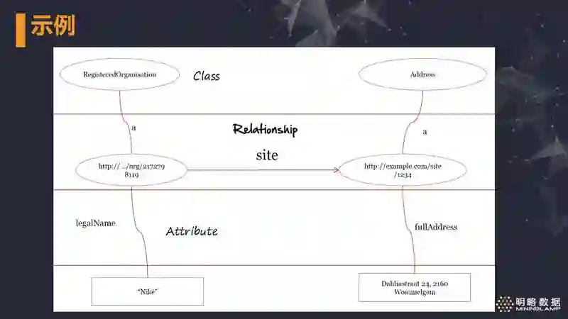 这张图清楚的展示了 class,attribute 和 relationship 三者之间的关系。第一层中的元素是 class,如 RegisteredOrganisation 和 Addrees;第二层则是 class 对应的实例,而实例之间的 site property 即为 relationship,地址实例 http://example.com/site/1234 的 fullAddress property 则是属性 (attribute) 类的 property. 简单的理解,一般情况下 attribute 类型的 property 的 object 是字面值;而 relationship 类型的 property 的 object 也是一个 IRI。