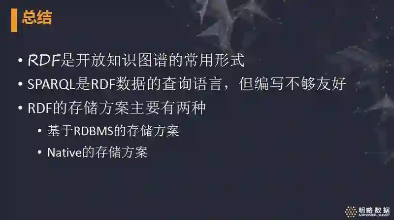 本次分享主要介绍了 RDF 在管理知识图谱方面的基本概念和技术。RDF 是目前开发知识图谱的常用序列化形式;SPARQL 作为 RDF 的标准查询语言,对于用户而言仍然不够十分友好,需要探索更加简洁方便的查询方式;针对 RDF 的存储,基本思路有基于 RDBMS 和基于 native 等两种存储方案。每一种方式都有各自的优缺点,需要根据实际情况进行选择。
