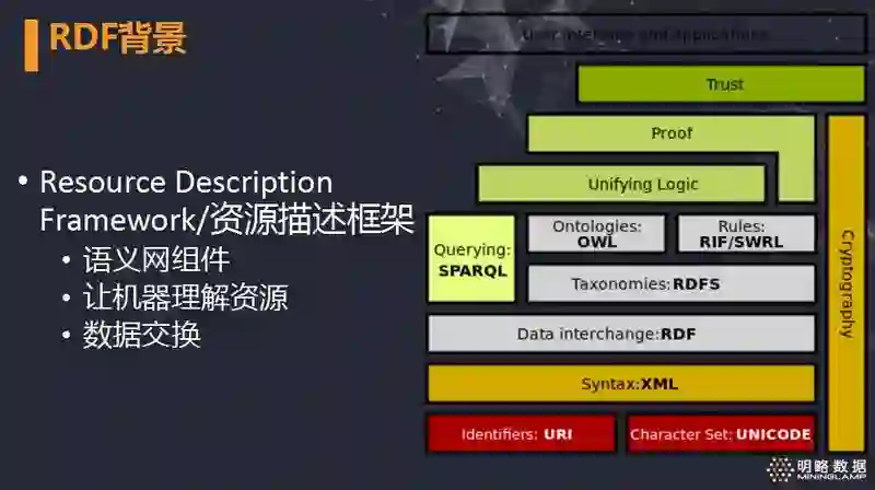 右图描绘出了 RDF 在整个语义网络技术栈中所处的位置,从中可以看出,RDF 主要负责数据交换,并通过 RDFS 能让机器理解网络中的数据真正的含义,而不仅仅是简单的字符串。