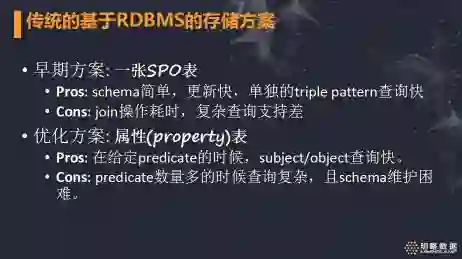 经典的基于 RDBMS 的存储方案其发展过程可以分为两个阶段:在早期,人们把 RDF 中的 Triples 当做一张完整的只有 SPO 三列的大关系表,并直接存储于像 MySQL,Postgresql 等 RDBMS 系统。