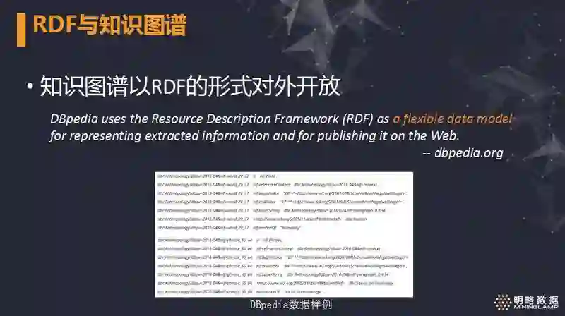 以 DBpedia 为例,其官方文档里有这么一段话,“DBpedia 以 RDF 作为一个灵活的数据模型用来表示抽取的信息,并发布到网上”。下图展示了 DBPedia 知识库中以 RDF 表示的知识样例。