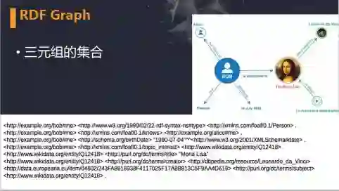 为了灵活共享上述知识图谱,使其具有一定的可读性,同时保证机器也能够方便理解知识,事实上,大部分的开放的知识图谱,都是以 RDF 形式对外开放。