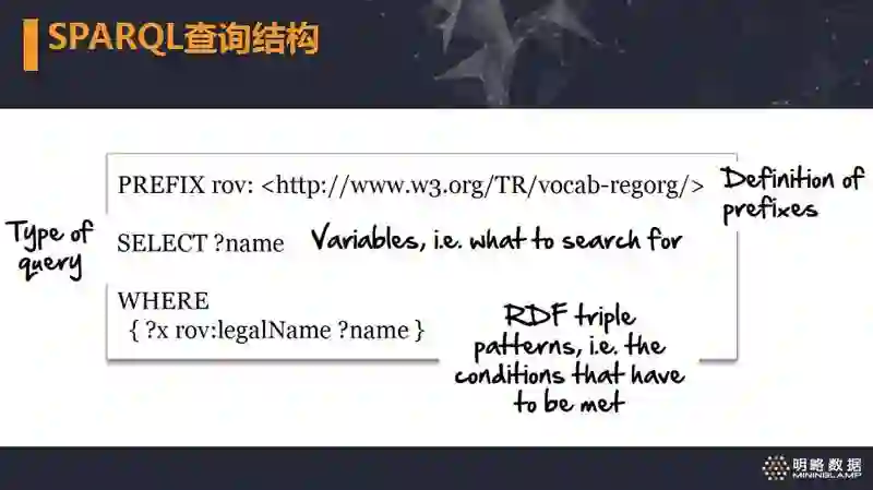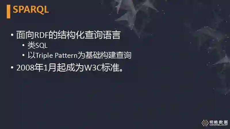 SPARQL 是针对 RDF 数据进行结构化查询的语言,类似于关系数据模型上的 SQL 语句,不同的是 SPARQL 查询中以 Triple Pattern 为基础构造查询条件,而不是针对行列的限制。自 2008 年 1 月起,SPARQL 也成为了 W3C 的标准。SPARQL 的提出一定程度上简化了 RDF 数据的访问,也为 RDF 的管理提供了一个统一的入口。