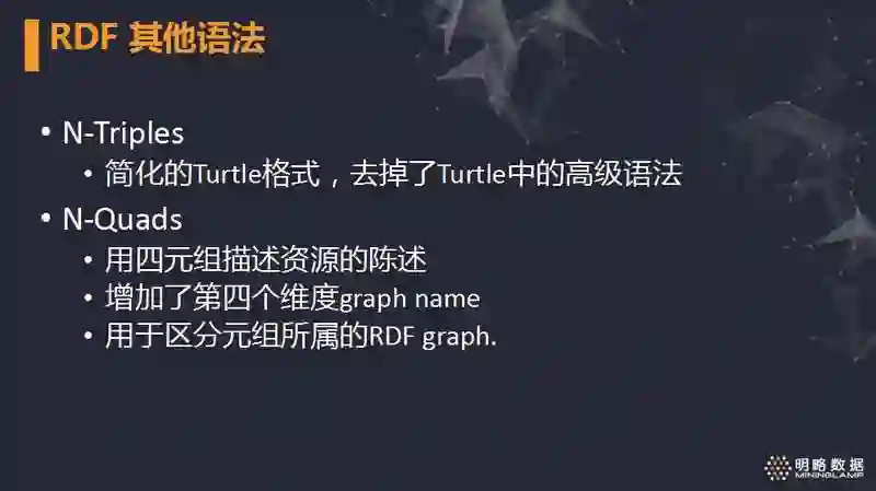 而 N-Quads 则是在三元组的基础上增加了一个维度,成为四元组。新增加的维度表示 graph name,即元组所属的 RDF graph 的名称,这就能够进一步区分 SPO,有利于进行数据融合和管理。