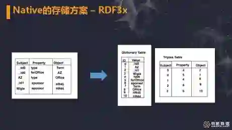此图展示了 RDF3x 中对三元组的存储样例。一个原始的 RDF 数据集转化了一张字典表和一个 Triple 表。