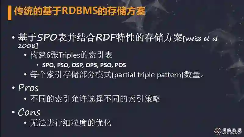 此法的优点是 6 个不同的索引使得不同的查询模式可以选在不同的查询策略进行优化,缺点是直接利用 RDBMS 中的索引机制失去了针对 RDF 数据访问特性的细粒度优化的机会。