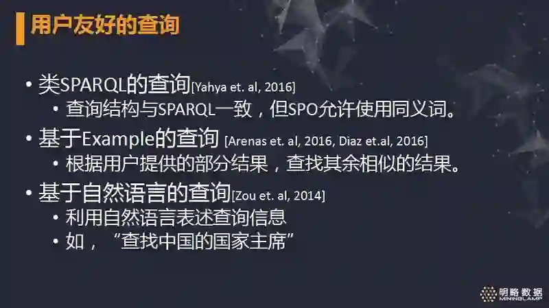 为了解决这个问题,提升 SPARQL 的易用性,现在有不少研究工作期望提出用户友好的查询。让用户以更加简洁清晰的方式表达查询,系统自动的将其转化为标准的 SPARQL。这里举三个例子。