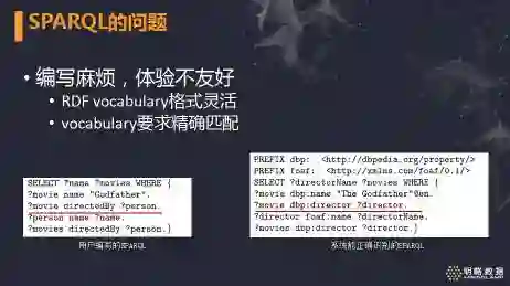 这里也有个例子,“查询 Godfather 这部电影的导演的其他作品”,左图是用户习惯书写的格式,而右图是在 dbpedia 上系统能够正确识别的查询。