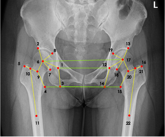 那么有没有可能通过某些自动化方法或者软件来完成准确而且标准的髋关节置换规划?答案是可行的。2018年左右,来自约翰霍普金斯大学的学者曾经提出通过两阶段卷积神经网络结构(CNN)来检测X射线成像图谱的手术测量标志点,并且能够从任意角度来完成成像检测。同时,也有有其他的一些研究试图引入人体解刨学特点,通过找到原本手术测量标志点之间的关系自动标注。但是在实践环节中,这些方法的准确率相较传统方案,并没有提升太多。
