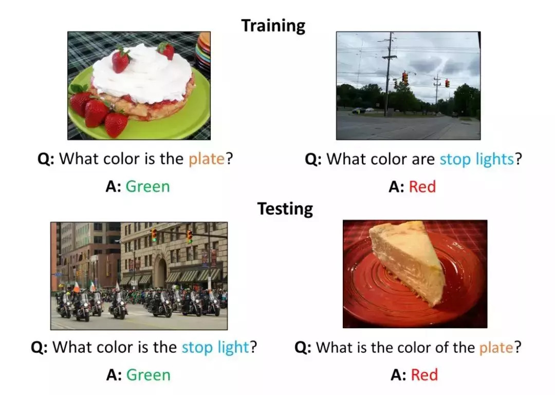 图 4. 组合性 VQA 数据集(C-VQA)的示例。测试集中词语的组合是模型在训练集中没有学习过的,虽然这些组合中的每一单个词在训练集中都出现过。图片来源于 Agrawal et al. 2017。