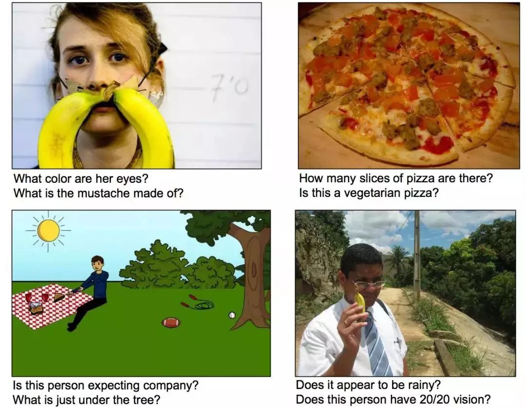 VQA v1 数据集和 VQA 挑战赛不仅促进了原有解决方案的改进,更催生了一批新的模型和数据集。例如,使用空间注意力来聚焦与问题相关的图像区域的模型(Stacked Attention Networks, Yang et al., CVPR16);以分层的方式共同推理图像和问题应该注意何处的注意力神经网络(Hierarchical Question Image Co-attention, Lu et al., NIPS16);可以动态组合模块的模型,其中每个模块专门用于颜色分类等子任务(Neural Module Networks, Andreas et al., CVPR16);使用双线性池化等运算融合视觉和语言特征,从而提取更丰富的表征的模型(Multimodal Compact Bilinear Pooling,Fukui et al.,EMNLP16)。