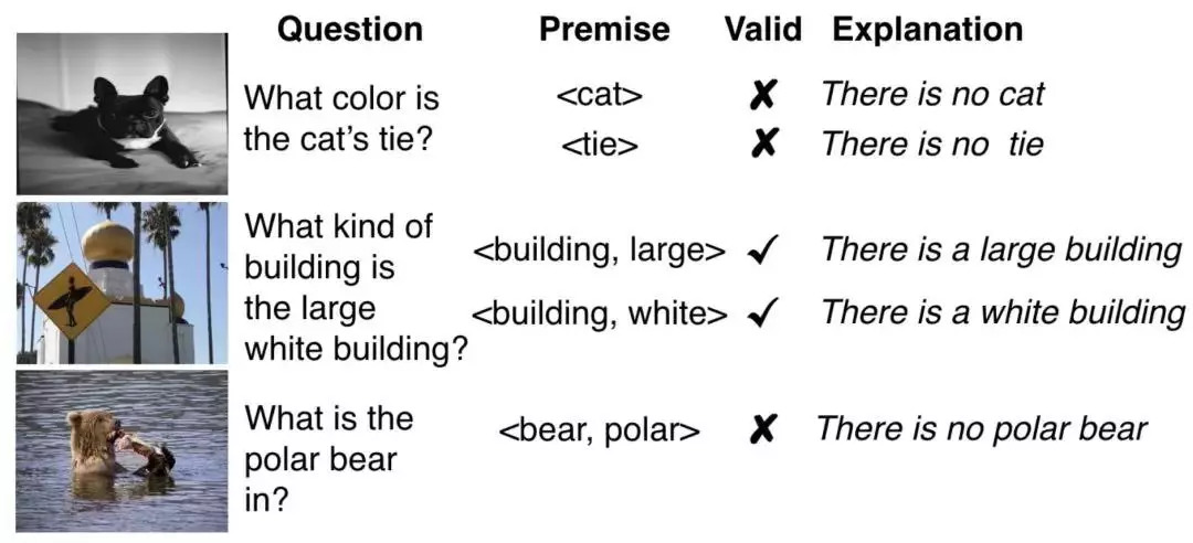 图 6. VQA 问题中常常包含一些隐藏前提,会提示一部分图像信息。因此 Mahendru et al. 构造了「问题相关性预测与解释」数据集(Question Relevance Prediction and Explanation, QRPE)。图中例子展示了 Mahendru et al. EMNLP 2017 一文中「错误前提侦测」模型侦测到的一些前提不成立的问题。