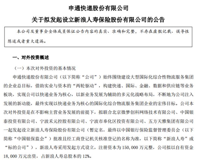 9月20日消息,申通快递晚间公告,拟联合北京微梦创科网络技术有限公司、中国银泰投资有限公司、宁波禾元控股有限公司、宁波市奉化区投资有限公司、五方天雅集团有限公司一起发起设立新浪人寿保险股份有限公司,新浪人寿采用发起方式设立,公司拟以自有资金1.8亿元出资,占新浪人寿总股本的12%。