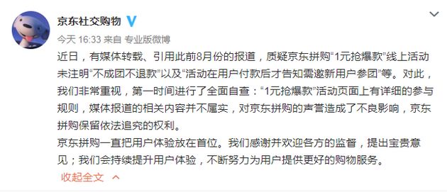 4.京东回应“1元拼购致5万人上当”:媒体报道不属实