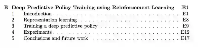 有许多心理学研究通过利用感觉运动偶然性来理解长期预测在实现认知行为中的重要性。在这里,我们介绍一些与本文更相关的内容。默勒和申克[ 57 ]训练了一个估计视觉观察变化的视觉前向模型和一个预测与障碍物碰撞的触觉前向模型,以便在模拟移动代理上学习简单的导航任务。他们证明,该代理可以仅仅基于所学的感知运动偶然性来区分通道和死胡同,这是通过试图找到一系列内部模拟的动作来实现的,这些动作不会导致前向模型预测的碰撞。申克等人。[ 59 ]研究了视觉前向模型的潜在作用,以抓住人眼中央凹区域之外的物体,即没有完全视觉敏锐度的视网膜部分。他们假设,在计划手臂运动以抓住物体之前,视觉固定是内部模拟的。他们在机器人平台上验证了他们的假设,方法是训练一个视觉前向模型,并使用该模型使用所提出的范例来抓取视网膜中央凹外的物体。