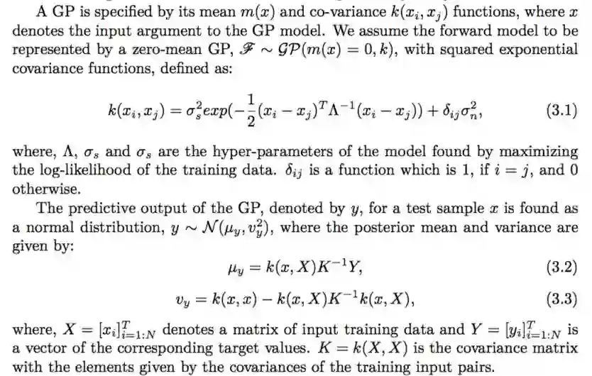 GP由它的均值m ( x )和协方差k ( Xi,XJ )函数指定,其中x表示GP模型的输入参数。我们假设前向模型由零均值GP,F∼GP ( m ( x ) = 0,k )表示,具有平方指数协方差函数,定义为:
