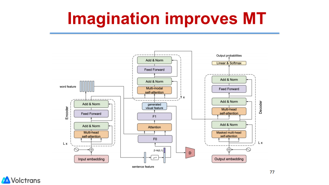这个效果也是非常好的。整个模型结构这里就不展开了,简单说就是先通过文本生成图像信息,再把文本和图像一起编码,最后去做翻译。最后的结果还是非常不错的,我们在没有输入图像的情况下就能够和其他的一些多模态的有图像输入的模型达到相当或几乎一样的效果。