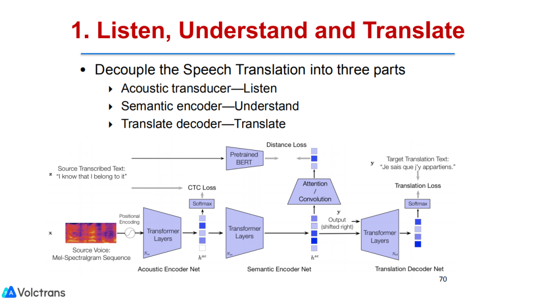 另外还有一些工作其实也是和之前的工作思路比较接近,我们希望通过pre train model引入语音信息或者多模态信息。我们做了一个解耦的端到端的语音翻译,把语音翻译分成多个阶段,但还是采用端到端方式。我们采用acoustic transducer做语音信息的监督,然后做语义信息的监督,把bert这种pre train model或者MT encoder的一些knowledge放到语音翻译里面起到帮助作用,最后再做翻译,也取得了很多SOTA结果。