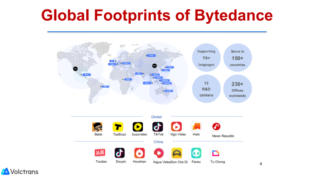 字节跳动诞生伊始就以国际化为目标,从我们的名字上就可以看出,字节跳动先有的英文名Bytedance,然后才定了中文名字节跳动。所以字节在建立之初就很重视做全球化的产品。目前字节在全球化方面,相对来说,都比较成功。比如TikTok,在全球上百个国家和地区都有用户,并且占据绝大多数国家的应用排行榜榜首。