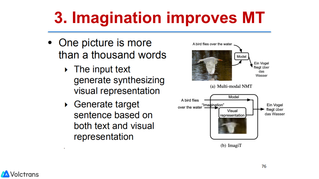 我们也以类似的思路做了图像翻译,但不同于之前的多模态图像翻译。之前的多模态图像翻译更多的是把图像和文本综合起来,我们的输入必须要求一段文本配合一个图像做翻译,会有一些局限性。一方面是没有办法利用到大规模的文本图像数据,你必须需要triple数据,就是中英的pair加图像,这样的数据是非常稀缺的,几乎没有。另外一个点是使用起来不方便,我们的input必须是图像加文本。所以我们想做的是imagination,给定一个文本,想象出它的图片,然后再拿文本和图像一起做翻译。