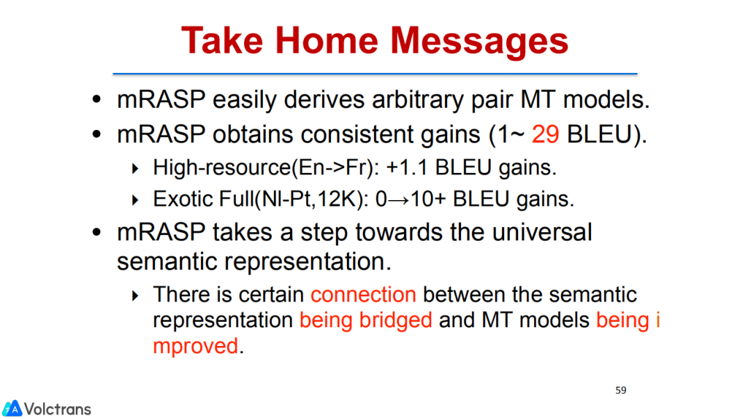 同样的一个思路,我们思考如何做pretraining,因为之前的pretrain model可能大家是用bert和GPT做,下游任务做fine-tuning,我们也在思考如何做一个针对机器翻译的multilingual的pretrain model,可以在任何机器翻译的方向上做fine-tuning,相当于机器翻译领域的bert,让整个过程变得更简单高效。