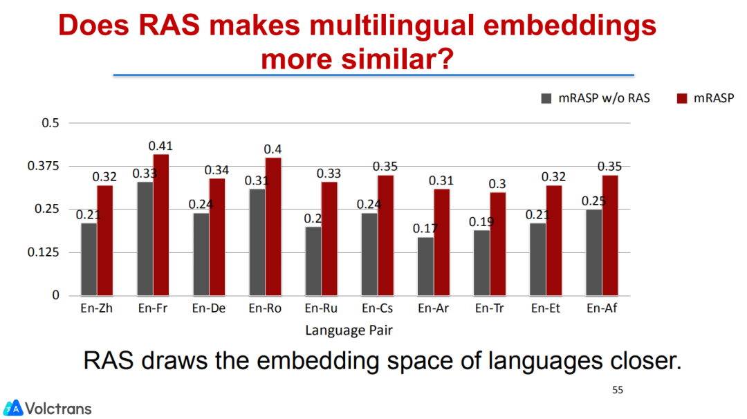另外我们也做了一些分析,发现它确实拉近了多语言之间的相似性。通过RAS替换,语言之间的cosine similarity以及表示更接近了。