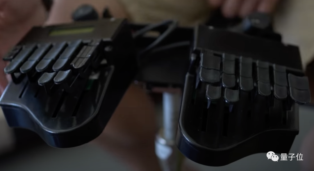 对,你没看错,这种新型打字机(CharaChorder)没有按键,而是靠每个手托上的9个摇杆来输入字符。