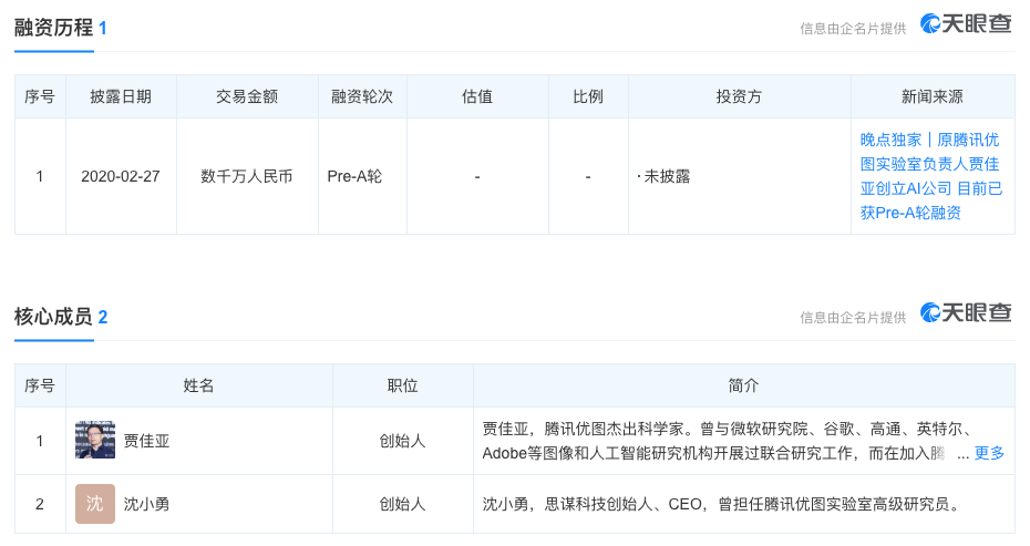 。该公司的创始人为贾佳亚、沈小勇,其中,沈小勇曾担任腾讯优图实验室高级研究员,他也是贾佳亚的学生。