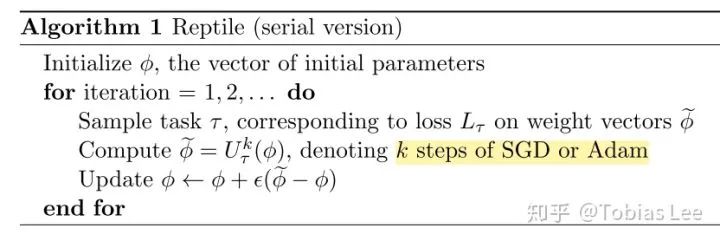 当然,也有研究者认为这样的二阶导数计算复杂,所以也提出了 REPTILE,一个一阶的 Meta-Learning 算法,框架如下: