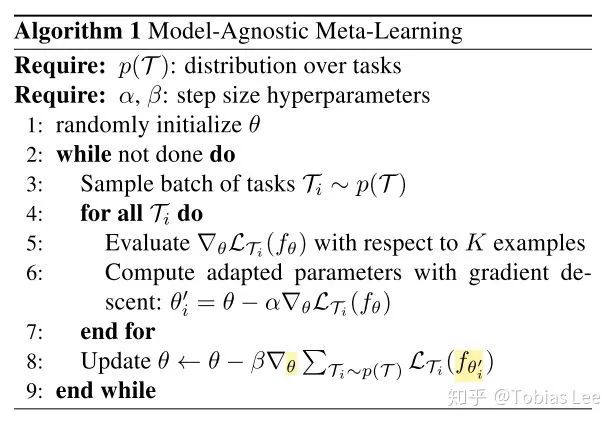 值得注意的是这里的 只是一个临时的模型参数,最后使用的还是更新过的 。因为外循环通过对模型内循环得到的更新后的参数求导,所以这里隐含着二阶导数,当然,对于有着 Autograd 框架的我们来说只要 loss.backward() + optimizer.step() 就好。