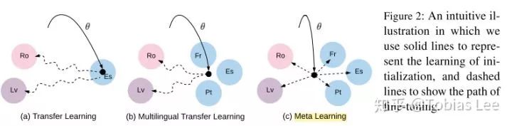 Meta-Learning for Low-Resource Neural Machine Translation: EMNLP 2018 的文章,是 Meta-Learning 在 NMT 上的一次尝试,思路也很直接,机器翻译任务中存在着大量的语言,他们的语料因为使用范围、人数等原因本身就少,规模不大。那么,能不能利用富语料 e.g. En-De / Ch-En 做预训练,从而快速地 fit 小语料的翻译任务呢?套用 MAML 的框架,如果我们把每一个语言对视作是一种 task,那么只有少量数据的语言对的翻译就是 MAML 对应的 k-shot learning 问题,文章也给出了一个很直观的示意图: