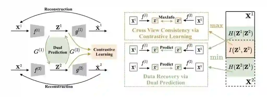 方法:基于上述观察,论文提出了对偶预测范式并将其与对比学习结合,通过一个新的损失函数实现了跨视图一致性与可恢复性的联合优化。提出的损失函数包括三部分:1)视图内重构损失,主要用于学习各个视图数据的视图特殊表示,由一系列独自的自编码器重构损失组成;2)跨视图对比学习损失,通过最大化不同视图间的互信息学习多视图一致性;3)跨视图对偶预测损失,通过最小化视图表示的条件熵进而实现视图数据恢复。