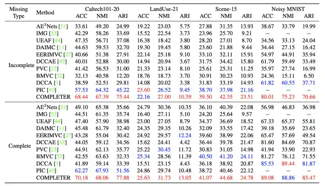 表2.对比实验。表中,缺失模式“Incomplete”表示50%的数据有缺失,“Complete”表示数据完整。红色与蓝色分别标记出最优与次优的结果。