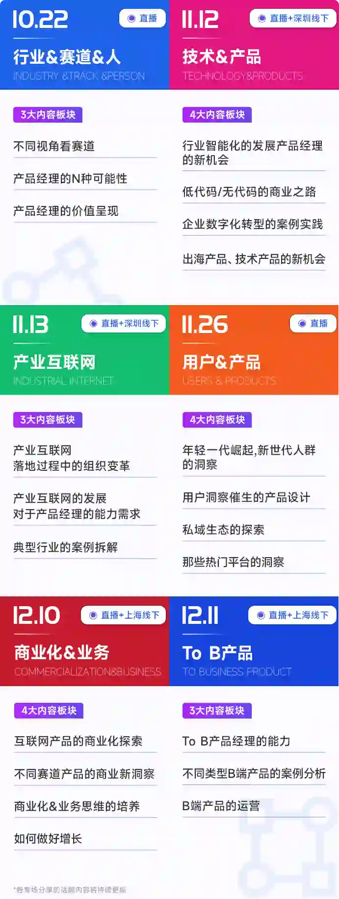 今年完整的产品经理大会,共有6个专场,其中4个专场,会同步筹备线上直播专场和线下会场: