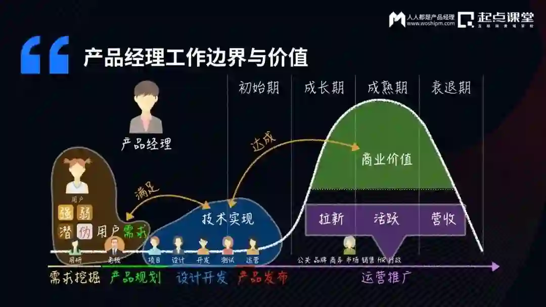 早期的产品经理,我们更多可能是在前2个阶段。初始期之前,挖掘用户需求,做产品设计、产品规划、产品的开发,到产品的发布,这可能是绝大部分同学认为的产品经理边界。