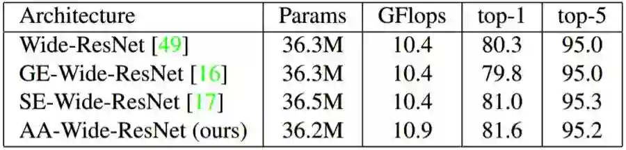 表 1:使用 Wide-ResNet 28-10 架构在 CIFAR-100 数据集上的图像分类结果。我们比较了基准模型与参数更少的 Gather-Excite (GE)、Squeeze-Excite (SE) 和新提出的注意增强 (AA) 的 top-1 与 top-5 准确度。