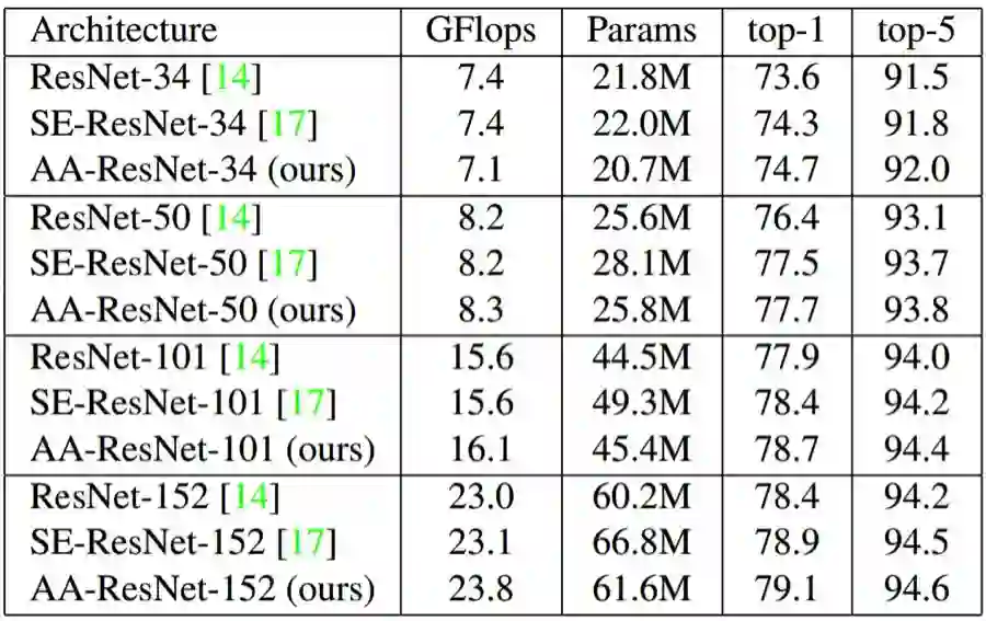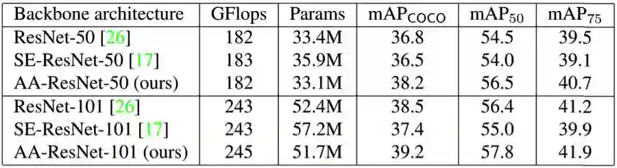 新方法在 CIFAR-100 和 ImageNet 分类任务以及 COCO 目标检测任务上进行了测试,涉及到多种不同的架构和不同的计算成本预算,包括一种当前最佳的资源受限型架构。注意增强仅需极少量的计算负担就能实现系统性的改善,并且在所有实验中都明显优于流行的 Squeeze-and-Excitation 通道式注意方法。尤其值得提及的是,注意增强在 ImageNet 上实现的 top-1 准确度优于 ResNet50 基准 1.3%,在 COCO 目标检测上超过 RetinaNet 基准 1.4 mAP。实验还有个让人惊讶的结果:在 ImageNet 上全自注意模型(注意增强的一种特例)的表现仅略逊于对应的全卷积模型,这说明自注意本身就是一种强大的图像分类基本方法。