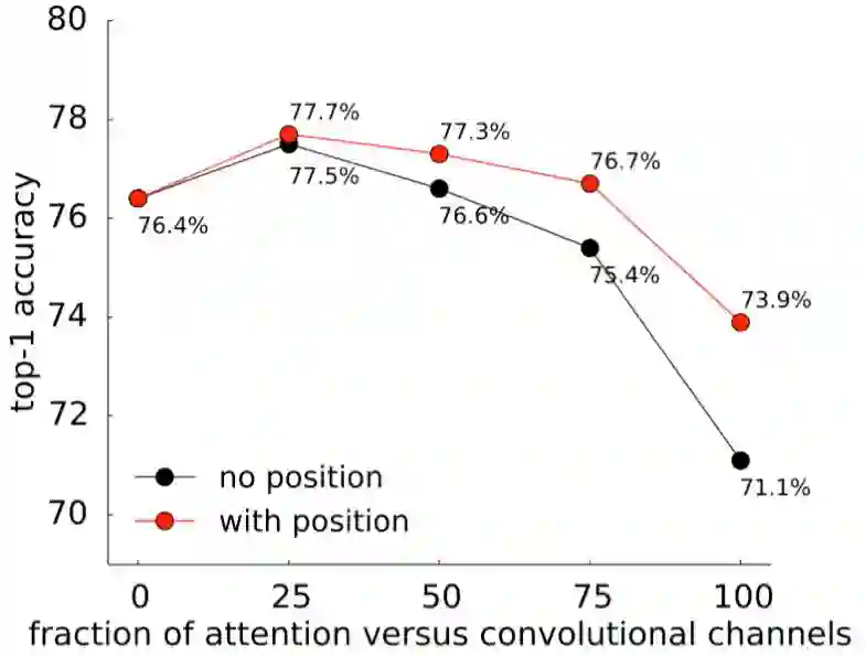 这篇论文研究了将自注意(用作卷积的替代)用于判别式视觉任务的问题。研究者开发了一种全新的二维相对自注意机制,能够在纳入相对位置信息的同时维持平移等效性,这使得其非常适用于图像。研究表明,这种自注意方案非常有竞争力,足以完全替代卷积。尽管如此,对照实验表明,将自注意与卷积两者结合起来得到的结果最佳。因此,完全摈弃卷积思想是不妥的,而应该使用这种自注意机制来增强卷积。其实现方式是将卷积特征图(强制局部性)连接到自注意特征图(能够建模更长程的依赖)。