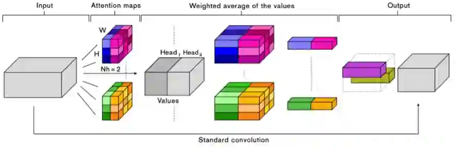 图 2:注意增强型卷积:对于每个空间位置 (h, w),都根据查询和键值在图像上计算出 N_h 个注意图(attention map)。这些注意图被用于计算 N_h 个这些值的加权平均 V。然后将所得结果连接起来,再重新调整形状以匹配原来的体空间维度并与一个逐点卷积混合。多头注意是以并行的方式应用于标准的卷积运算,输出再连接到一起。
