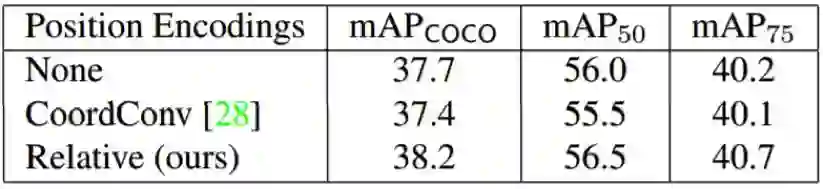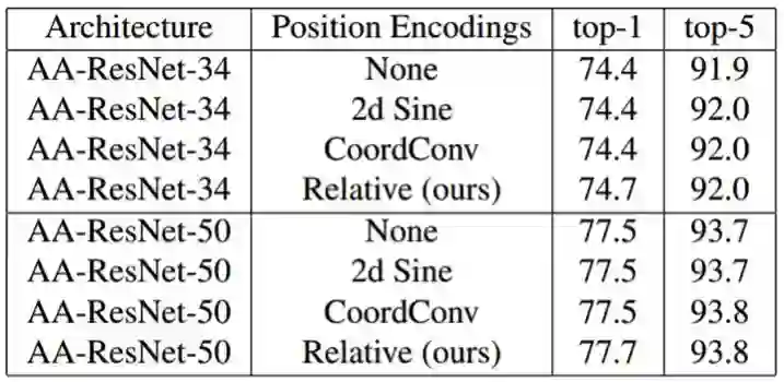 表 7:在 COCO 目标检测任务上,使用 RetinaNet AA-ResNet-50 骨干时注意增强中不同位置编码的效果。