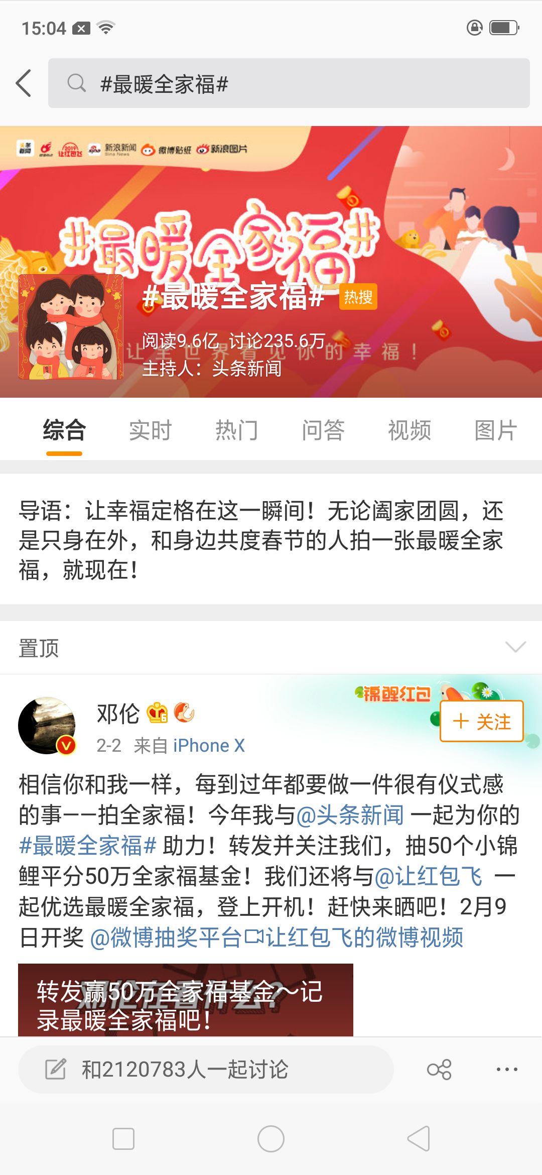比如,各类春节相关话题也受到网友的积极参与,网友们纷纷用手机纪录分享春节故事,通过文字、镜像定格幸福温暖瞬间。截止目前,#最暖全家福#话题阅读量达到9.6亿,讨论超230万。#春节摄影大赛#阅读达到50亿,讨论量超过409万。